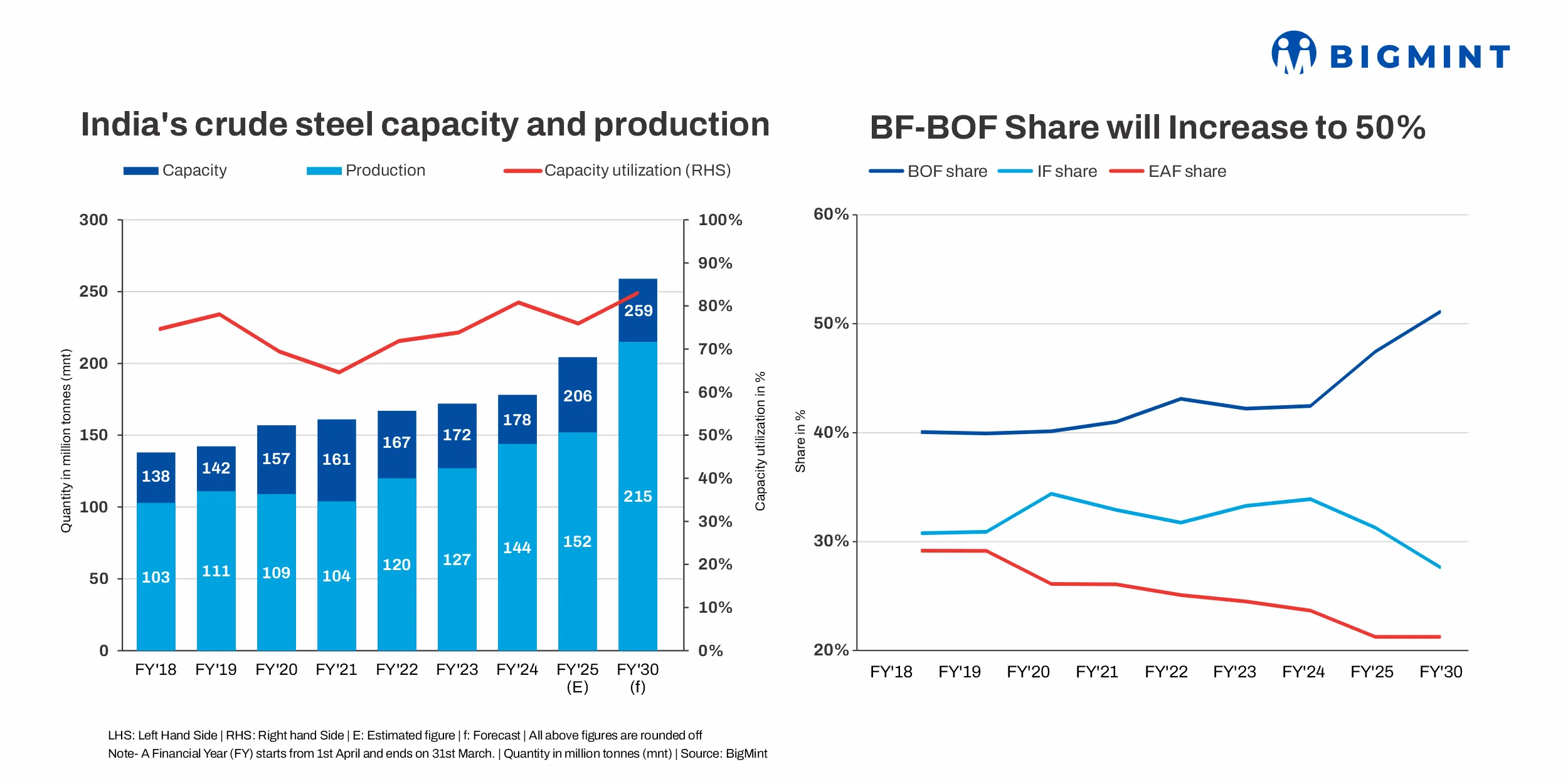 India's National Steel Policy 2017 aimed for a steel capacity of 300 million tonnes by 2030-31, but the COVID-19 pandemic has delayed this target by 2-3 years, with crude steel capacity now expected to reach 242 million tonnes by 2030. BigMint forecasts steel production to reach 215 million tonnes by then, assuming a 7-8% CAGR. By 2030, the share of steel production via the Basic Oxygen Furnace (BOF) route is projected to rise to 50%, while the Electric Arc Furnace (EAF) and induction routes will maintain a combined share of 45%.